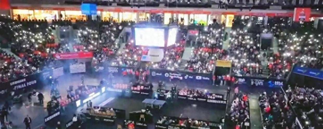 德国比赛的观众席离球台特别近,前后排观众几乎就站在挡板旁边。 这种布局让球迷能清楚看到运动员发球的旋转,听见球拍击球的声音。 与中国大满贯形成鲜明对比的是,后者场馆过大,普通观众难以直接感受比赛氛围。 德甲开场前,主持人会喊话“请大家打开手机闪光灯”,而WTT比赛开场前广播里一遍遍提醒的是“请关闭闪光灯”。